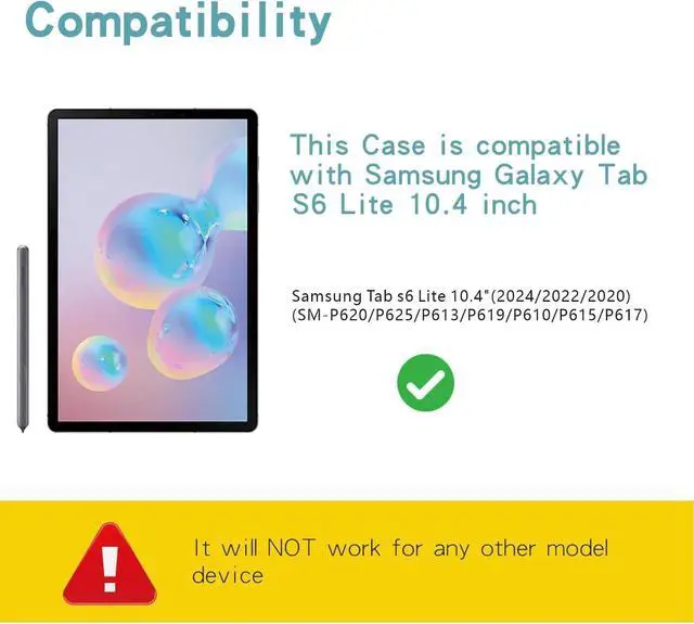 Compatibility: Specifically designed for Samsung Galaxy Tab S6 Lite 10.4 inch 2024/2022/2020 Model SM-P620/P625/P610/P613/P615/P619 2022/2020 Release Tablet. It will NOT work for any other model device. ^^ Trackpad Keyboard Detachable Bluetooth keyboard with Touchpad transforms your tablet into a laptop in less than a second. When you don't have a mouse in your hand, it will help you a lot. ^^ Built-in Pencil holder Pencil Holder on the bottom can prevent the pen from being lost. Grab your Pencil effortlessly whenever you want, easily to carry your pencil with your device. **Pencil not included! ** ^^ Long standby timeBuilt-in premium Li-ion battery with energy-saving mode, 2-3 hours full charge, Standby up to 30 dayswork for at least 80 hours. ^^ Soft smooth TPU material The soft TPU back cover adopts non-slip design, Easy to install, Can support the tablet at multiple angles.