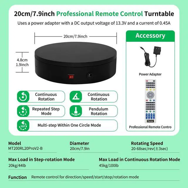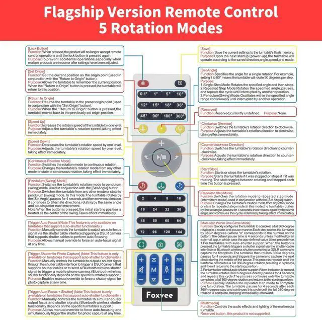 remote enables full-function control: One-key origin setting (paired with "Return to Origin" for precise reset); Save settings to the turntables built-in memory; Multi-level angle + mode key combinations, realizing refined control of the Remote-Controlled Rotating Display Stand. ^^ Five Rotation Modes for