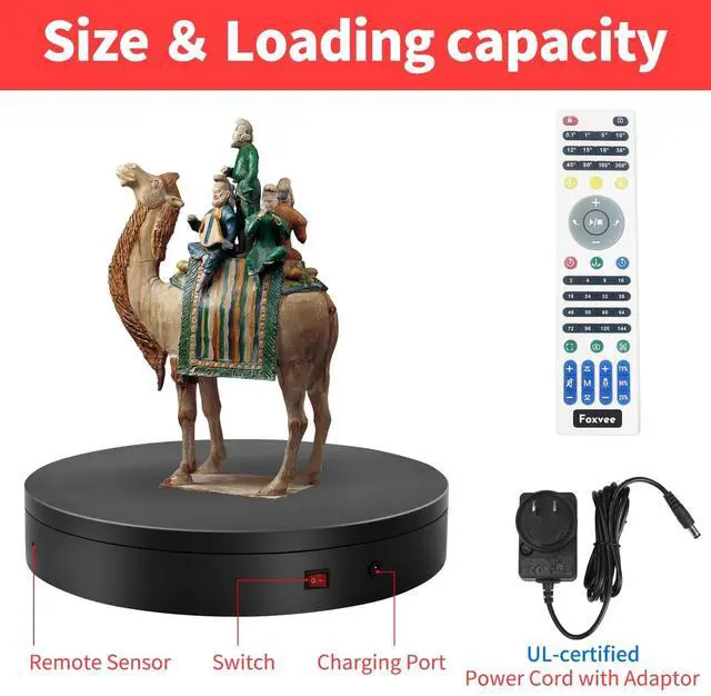 Output: DC 13.3V / 0.45A; US standard UL-certified plug; The Remote-Controlled Electric Turntable has passed FCC, CE, and ROHS certifications, ensuring safe use for all displays. ^^ 360 Full-Dimensional