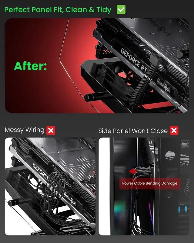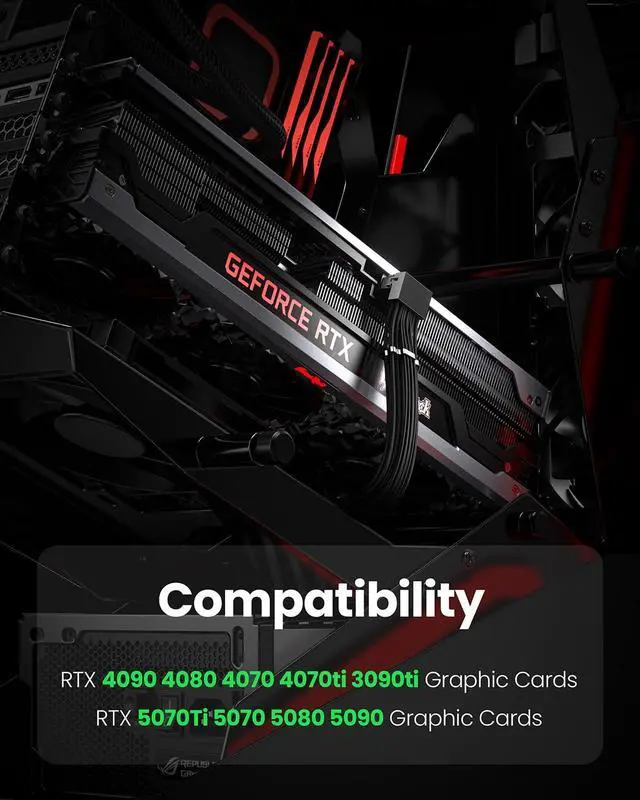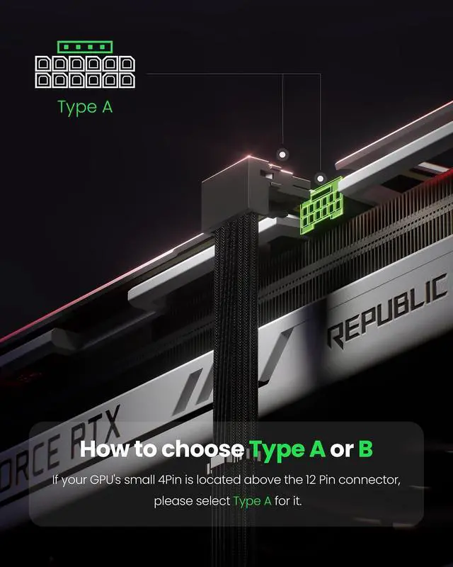 CompatibilityThis 12VHPWR (12V-2x6) extension cable is designed for GeForce RTX 3090 Ti, 4070 Ti, 4070, 4080, 4090, 5070Ti, 5070, 5080, 5090. It is also compatible with any other GPU featuring a 12V-2x6 or 12VHPWR interface. NoteThe 90-degree 16pin (12+4) converter is available in two directions. Type A is for GPUs with the small 4pin above the 12pin connector. Type B is for GPUs with the small 4pin below the 12pin connector ^^ 90 Degree Right Angled DesignThe 90 degree gpu connector prevents the graphics card's standard cables from contacting the panel.