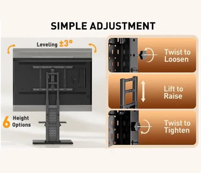 Simply rotate the orange button on top of the panel to adjust the tilt and set your TV to the perfect viewing angle, helping reduce glare and enhance viewing comfort ^^ JUST TURN THE KNOB TO ADJUST THE HEIGHTThe TV stand with mount features 6 post height settings, with intuitive tool-free knobs that make it easy to fine-tune the position for a comfortable and ergonomic viewing experience. Simply turn the knob on the back of the post to set your desired height ^^ SMART STORAGE & HEAVY-DUTY SUPPORTWith an adjustable shelf, pegboard and hooks, the universal TV stand offers ample storage space and spacious base for organizing remotes, speakers and other media devices, keeping your living space for easy accessibility.