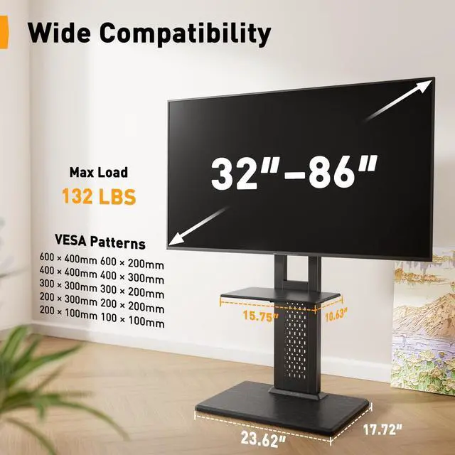 HEAVY DUTY TV STAND DESIGNED FOR 32-86 INCH TVsThe heavy duty tall TV stand is compatible with most flat or curved 32-86 TVs up to 132 lbs, supports VESA mounting patterns from 100x100 mm to 600x400 mm and easy to assemble with clear instructions and helpful tools. Please confirm your TV screen size, weight and VESA patterns before purchase ^^ PERLEGEAR TV MOUNT STAND FOR 6 HEIGHT ADJUSTMENT LEVELS Perlegear floor TV stand offers 6 height adjustment settings, allowing you to position your TV at the level that works best for you. Whether sitting or standing, you can effortlessly find the ideal viewing height for any occasion including bedroom, living room, guest room for yoga, gaming, or entertainment spaces ^^ SMOOTH 60 SWIVEL & TOOL-FREE TILTThe swivel tv stand for 85 inch TV features 30 swivel and tool-free tilt (+5/-10).