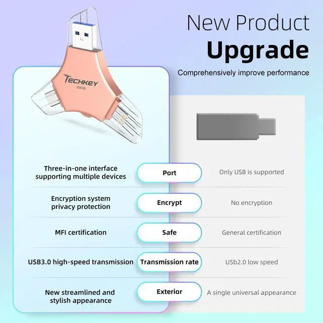 MFi Certified Multi-function Flash DriveThis flash drive is MFi certified, high quality and excellent performance, allowing you to store your data more securely without worrying about data loss. Made of high quality metal material and advanced chip technology, it has excellent dustproof, drop-proof and anti-magnetic performance. The flash drive has a 256GB capacity, easily free up space on your device. ^^ 256GB 3-in-1 Lightweight and Compact Memory StickThe flash drive has USB/Lightning/Type C interfaces, compatible with iOS devices with iOS 12.1 and above / OTG Android phones / PC with Win7 and above / MAC devices with MAC 10.6 and above, convenient for data transfer between different devices.