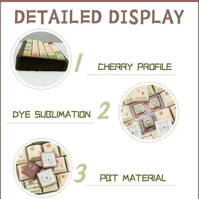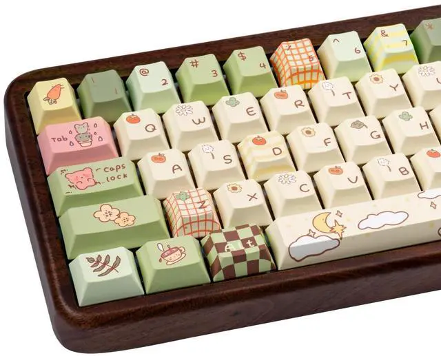[Cute Keycaps] This PBT cute cartoon keycap design is themed with a lovely forest, the cute bear pattern with green, brown and light yellow color creates a scene full of fairy tale atmosphere, bringing a touch of freshness and vitality to your mechanical keyboard. ^^ [PBT & Dye Sublimation] These custom keycaps made of PBT excel in durability, color vibrancy, typing feel, and ease of cleaning. Compared to ABS, PBT has better high hardness, abrasion resistance and high temperature resistance. With advanced dye sublimation technology, the color pattern is more vivid, not afraid of oil and dirt, and has a long service life.