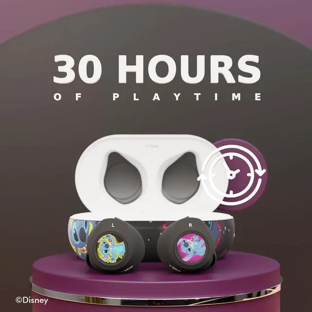 ^^ Features: Easily play or pause your favorite Disney tunes, skip to the next or previous track, adjust the volume, answer, or reject phone calls, and hang up, all with a simple touch. Up to 30 hours of playtime on a single charge with our built-in charging case and a seamless 33ft wireless connection distance.