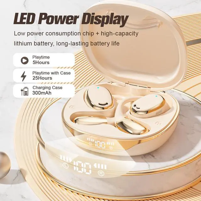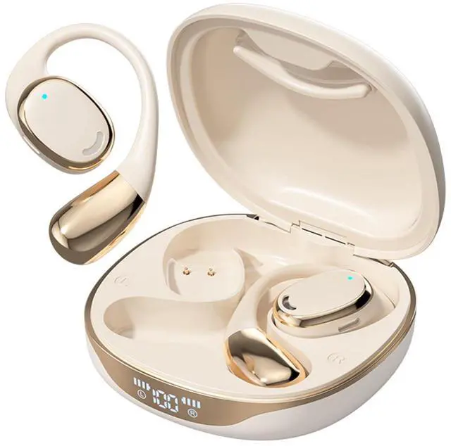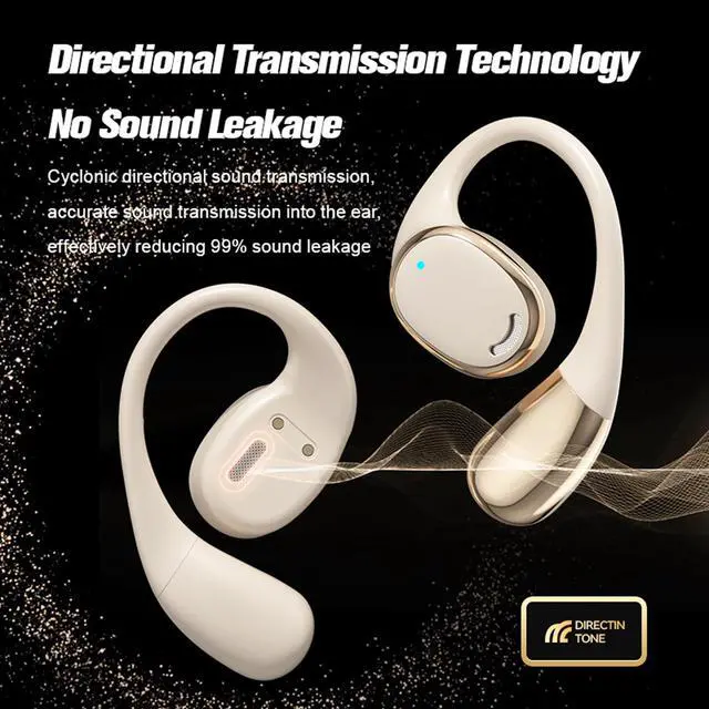 Electroplated metal texture open ear wireless bluetooth headphones. Stay in close contact with your surroundings at all times, the best earbuds for fitness. Features1. Open ear earbuds are made of non-slip& skin-friendly ABS, suitable for sports outdoor and daily use, will comfortable and stable to wear for a long time. 2. Through IPX5 waterproof Sweatproof nano-coating, the wireless headphones provide protection from sweat/ rainstorm, which fit for jogging, hiking, gym exercises, fitness, etc. 3. Open ear headphones are equipped with dual noise-canceling microphone for crystal-clear calls on both ends.
