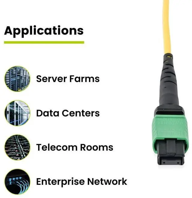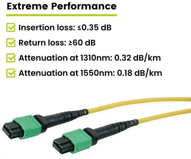 [Extreme Performance] Low loss OS2 single mode fiber for 40/100/400G up to 2 km (equipment dependent). Corning glass supports 1310/1550 nm wavelengths. Ideal fiber optic cable for data centers, SAN, and LAN. Stable IL 0.35 dB and RL 60 dB for clean optic links. ^^ [Quality Guaranteed] Elite MTP connectors feature a floating ferrule for consistent contact. Elliptical guide pin tips reduce debris and wear. Spring centering protects the array. Reliable fiber optics performance with low insertion loss across links. ^^ [Versatile] OFNP plenum optical cable is safe for plenum and nonplenum spaces.
