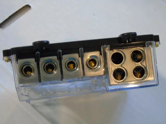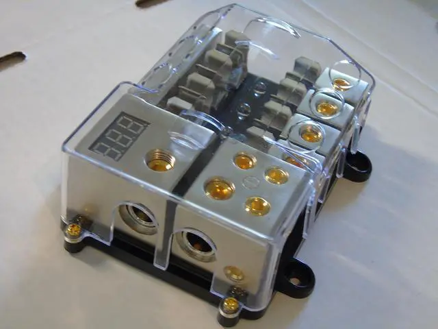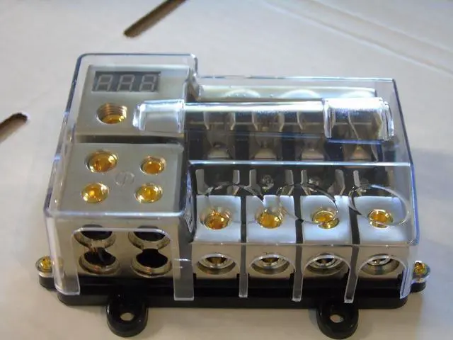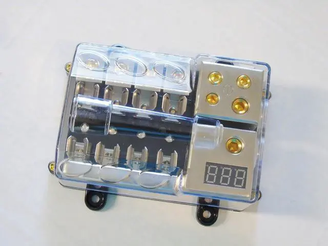 Unique Patent Pending Design Distributes both Positive and Negative. ^^ Black Bottom Housing Produces "Eye Candy" Special Effect. ^^ Digital Voltmeter Built In. Up to ( 2 ) 0 1 2 4 Gauge AWG USA Standard Input and Up to ( 4 ) 8 Gauge AWG Outputs ^^ 100% Platinum Plated Base Blocks with Gold Plate Set Screws ^^ AGU Fused Power Distribution Block, Uses Standard Automotive AGU Fuses.