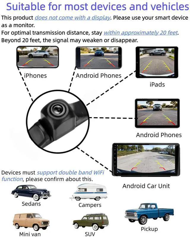 Ditch the Lag, Embrace Crystal-Clear 5GHz Wi-FiUpgrade WIFI Wireless Backup Camera to the superior clarity and stability of 5GHz Wi-Fi. Experience lightning-fast connectivity and a rock-solid signal for a buttery-smooth, real-time view that makes every drive safer and smarter. (1080P resolution, 170 degrees viewing angle, IP68 waterproof. Can be applied to vehicles which can provide 10-30V power supply like Campers, SUVs, RVs, Sedans, Minivans, pickups and so on) ^^ Your Phone as New Backup Camera DisplayTurn the device you always carry into your ultimate driving companion. Just download our app and pair effortlessly.