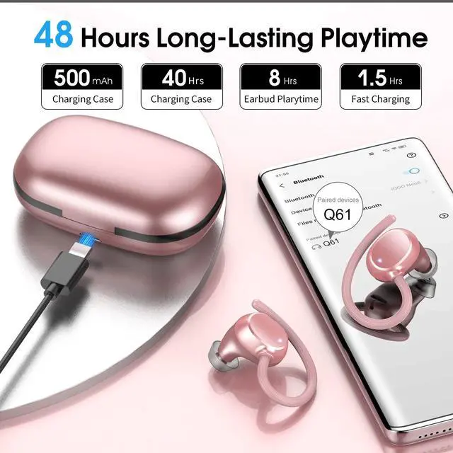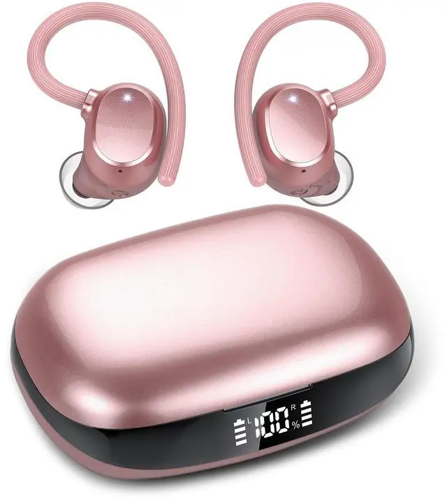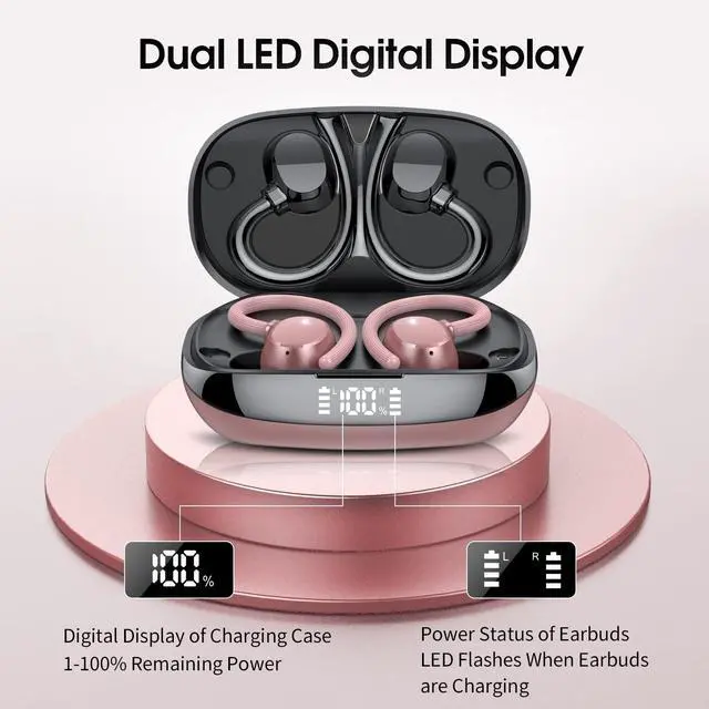 Digital Display: Single wireless headphones can be used for 7 hours, up to 48 hours of listening time, LED digital display charging case additional 5 times, left and right sides with earbud power display, each frame represents 25% of the power, LED lights will flash during the charging process. ^^ Sport Design and