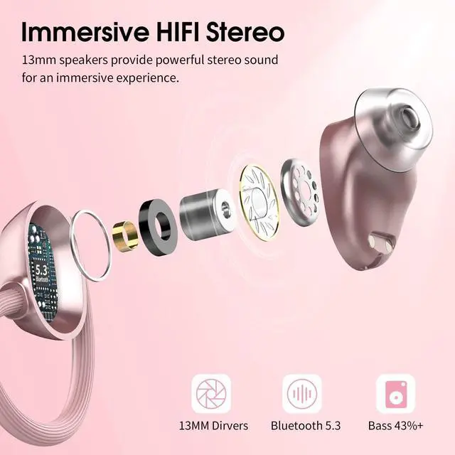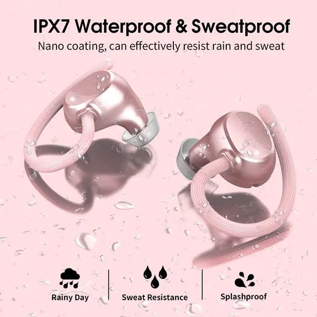 IP7 Waterproof: Flexible, soft silicone earhooks fit all ear shapes for a perfect fit in your ears, ensuring your earbuds stay comfortable and secure while playing sports and outdoor activities. The wireless headphones are IP7 nanometer waterproof, so you don't have to worry about rain and sweat to enjoy high quality music. ^^ Immersive Stereo and