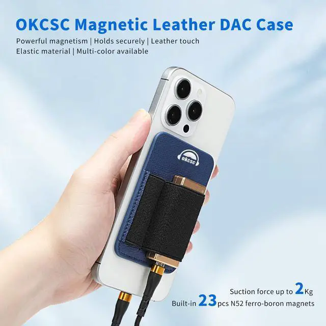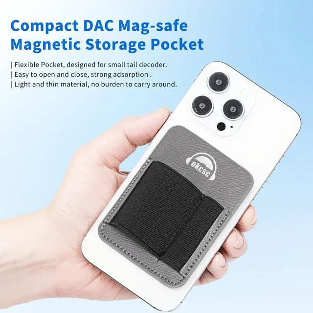 Smart Storage SolutionsOKCSC Magnetic Leather DAC Casewith powerful magnetism ^^ Holds securely ^^ Leather touch ^^ Elastic materiall ^^ 3color available, with Double Pockets to Prevent Falling Off, flexible Pocket, designed for small tail decoder. Secures devices in seconds! ^^ Universal Compatibility Includes magnetizing plate for non-Mag-Safe phones/cases. Works with DACs, adapters, AirPods cases, and small tech accessories. Includes a magnetizing sheet for attaching to non-magnetic cell phones or other devices. ^^ Ultra-Strong Magnetic Grip Built-in 23 powerful N52 ferro-boron magnets (suction force up to 4.4 lbs / 2kg) securely attaches to Mag-Safe-compatible devices.