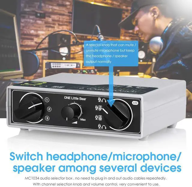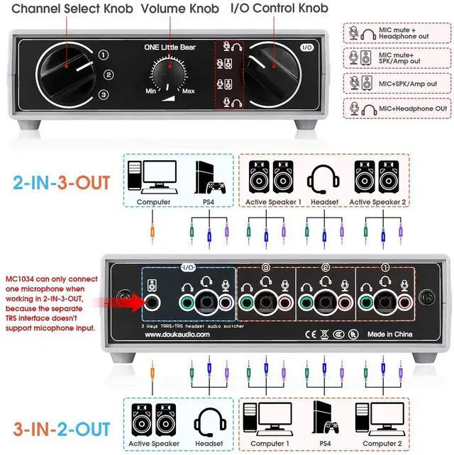 / 0.66 lbPackage weight: 400g / 0.88 lbWarm tipsDifferent kinds of headphone (without microphone) and headset (with microphone) with different connections and should be connected to correct interface, please refer to the connection diagram. MC1034 can be used as a pure audio switcher, supports 3-IN-2-OUT and 2-IN-3-OUT working mode, but the volume control only can work normally in 3-IN-2-OUT mode. MC1034 can only connect one microphone when working in 2-IN-3-OUT, because the separate TRS interface doesn't support microphone input. Packing List1*MC1034 Audio Switcher3*TRRS AUX Cable1*TRS AUX Cable