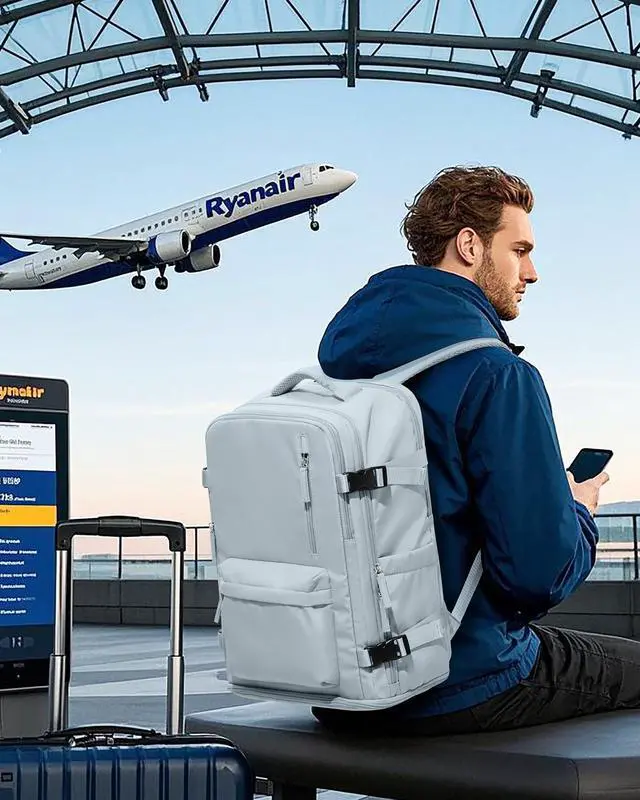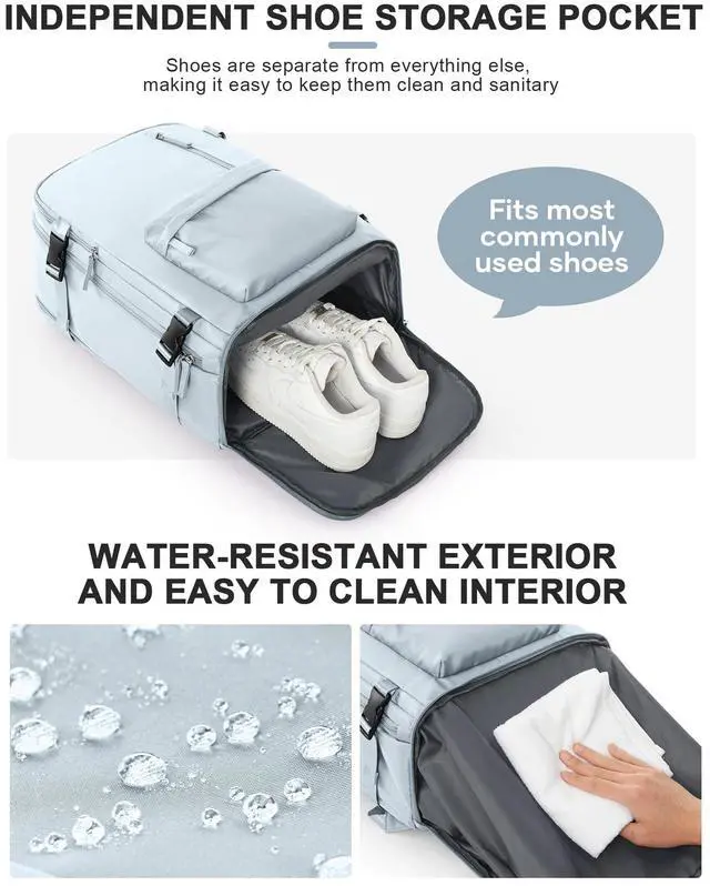 Large Capacity Multi-Pocket Backpack Travel backpack with multiple compartments. The main pocket can hold travel items and can accommodate 5-8 pieces of clothing. The main compartment features multiple small compartments for tablets, pens, headphones and other small items, and there is one side pocket and two pockets on the outside for quick access. ^^ With Trolley Sleeve A trolley sleeve on the back allows the travel backpack to attaches to the handle of a carry-on luggage for hands-free transport, easier carrying. ^^ Separate Shoe Compartment and Wet Pocket There is a shoe compartment at the bottom of the backpack to separate your shoes from other items and keep them clean.