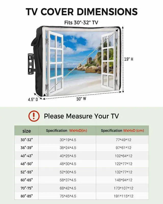 Waterproof & Weather Resistant: This outdoor tv cover measures 58"W x 37"H x 4.5"D, fits most TV from 60" to 65". (Please confirm your TV size before purchase. ) Our outdoor tv cover can well protect the tv from dust, rain, storm, snow, wind, UV resistant, hard elements and keep the screen clean and new ^^
