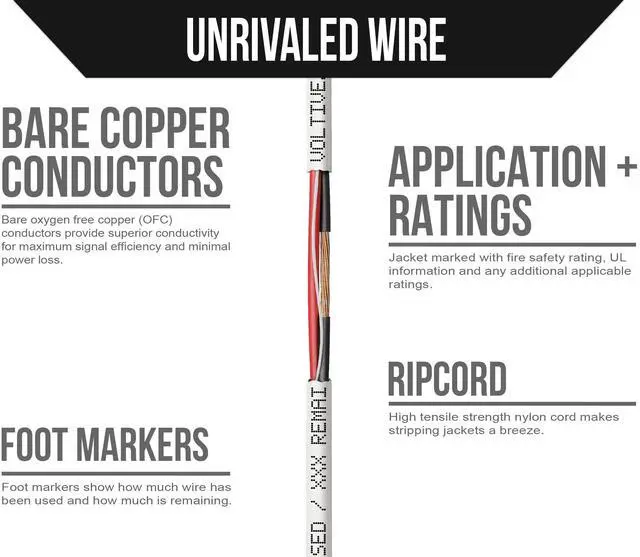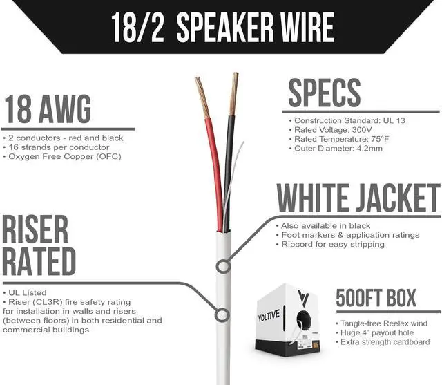 18AWG, 2 CONDUCTORS, WHITE JACKET, 500FT BOX. 18 gauge speaker cable, featuring 16 strand Oxygen-Free Copper conductors. Built to exacting standards with zero compromises. ^^ OXYGEN-FREE COPPER. Oxygen-free copper (OFC) conductors result in less signal loss and are more durable than conductors made of copper-clad aluminum (CCA). ^^ CL3R RATED. Riser (CL3R) fire safety rating for installation in walls and risers (between floors) in both residential and commercial buildings. UL Listed. ^^ TIME SAVING FEATURES. Patented winding technology & massive payout hole eliminate kinks and tangles.