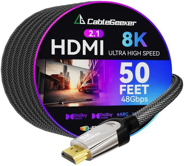 Long 8K HDMI 2.1 Cable 50FT, 48Gbps Ultra HD Lead High Speed Cord Connector, Supports 8K@60Hz, 4K@120Hz, eARC HDR10, HDCP 2.2/2.3 Dolby, VRR, Compatible with Fire TV/Roku TV/PS5/Xbox X/Switch etc