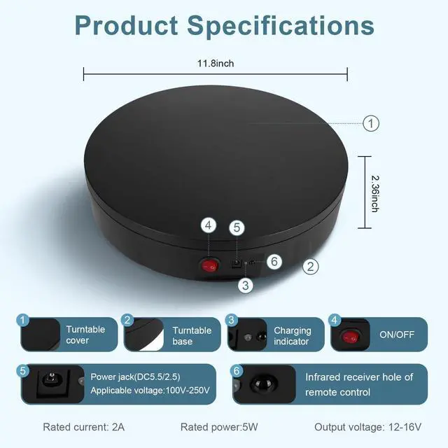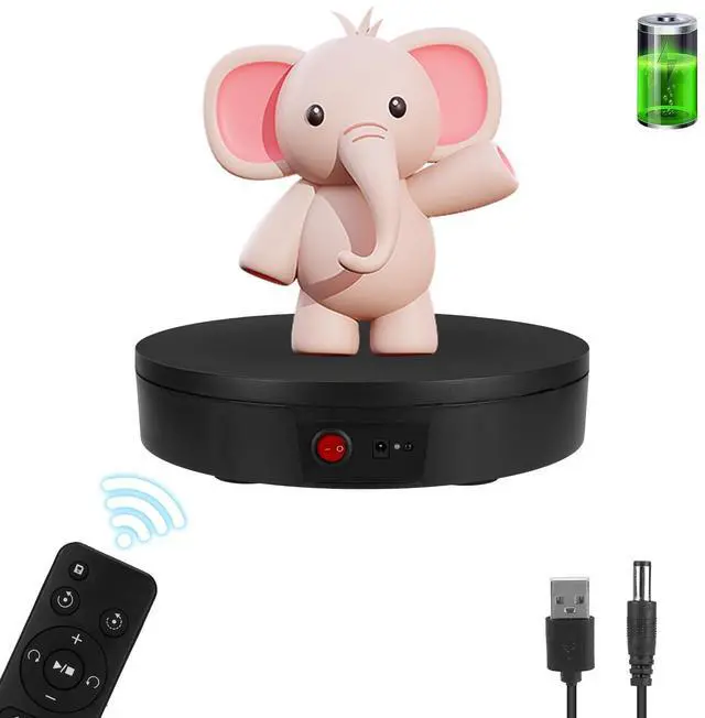 Rechargeable Wireless Rotating Display Stand- Two power supply modes: USB cable and built-in Rechargeable battery operated rotating. you could take it outdoors or anywhere to complete your photography No more worrying about finding a socket or being tethered to a specific location. ^^ Remote Control Speed & Angle- The speed range is 22-60 sec/rev (the fastest speed is 22 seconds per circle & the lowest speed is 60 seconds per circle) total 10 gears speed adjustable. Infrared remote control with controller available continuous and intermittent rotation modes, 45/90/180 angle circulation turning modes. ^^ 360-Degree Smooth Rotation and Lower Noise- The stand rotates a full 360 degrees, allowing customers to view your products from all angles. Widely using in retail stores, trade shows, Crystal Art, Jewelry or even in the home to showcase collectibles or artwork. 300 lbs centric loading capacity, 11.8 inch diameter, net weight 3 lbs, adapter