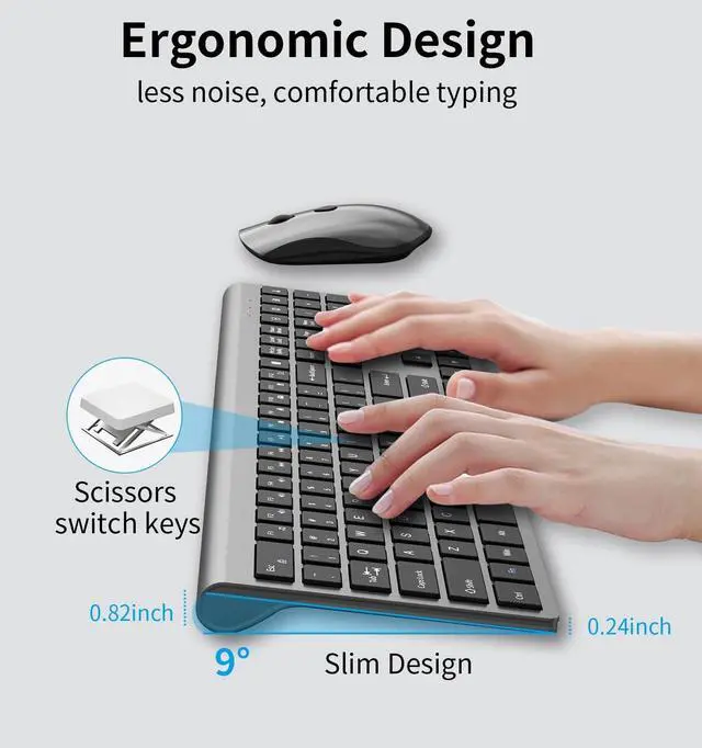 The calculator buttons allow you to quickly open the computers calculator program, saving you valuable time ^^ Ultra Thin & Ergonomic Design- The thin wireless keyboard has 110 keys and accommodates most typing habits while taking up less space than traditional full-sized keyboards. Its ultra-slim and streamlined shape adds a classy and minimalist touch to your small desktop. The ergonomic full size keyboard has a tilt angle for more comfortable typing and improved work efficiency ^^ Silent Keyboard and MouseAll keys on the office keyboard use scissor structure switches, making the keyboard ultra-thin, lightweight, responsive, noise free, and typing soft and comfortable.