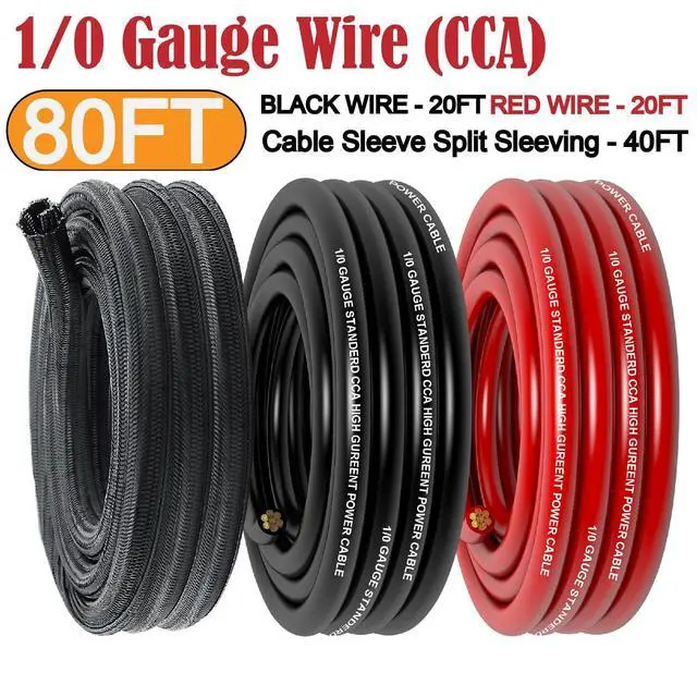 Include: 2 pcs 1/0 gauge wire (20 feet of each color), 10 pcs SC50-8 lugs, 10pcs SC50-10 lugs, 20pcs 3:1 heat shrink tubes, 1 pcs 40ft 1/2 inch PET Braided Cable Sleeve Split Sleeving, 1 pcs Installation Tool, Cable ties, Self adhesive cable base.