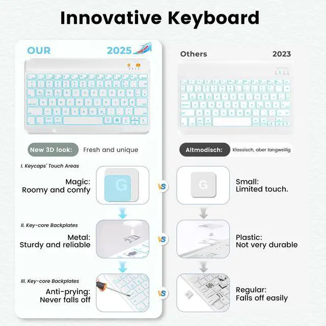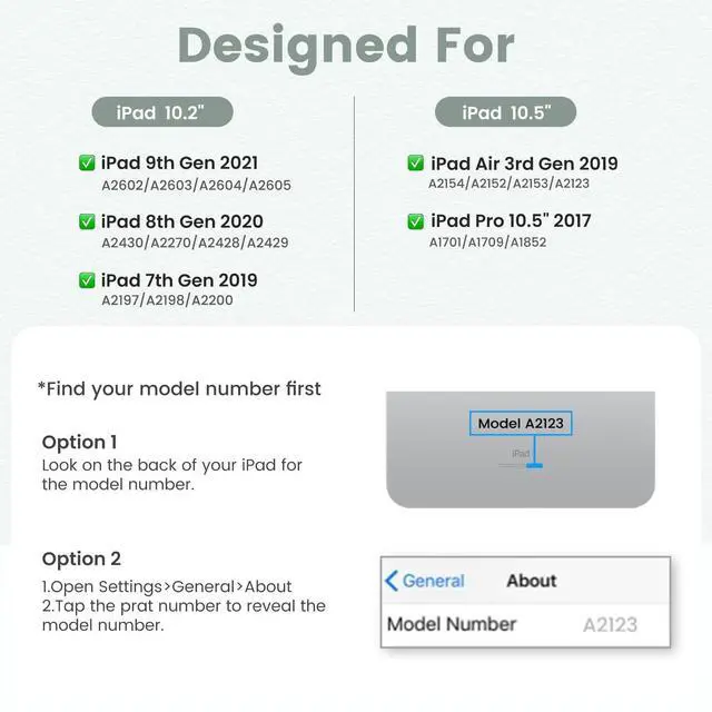 IPad 7th/8th/9th Generation Case with Keyboard CompatibilityOur iPad keyboard case is designed for new iPad 9th 2021 (Model number: A2602/ A2603/ A2604/ A2605), iPad 8th 2020 released (A2430/A2270/ A2428/ A2429), iPad 7th Generation 10.2 inch 2019 released (A2197/A2198/A2200), iPad Air 3rd Gen 10.5 -inch 2019 released (A2152/A2123/A2153/A2154) and iPad Pro 10.5 -inch 2017 released (A1701/A1709/A1852). ^^ No pen or charger included! It is Not compatible with any other devices. Please check the back bottom of your iPad to find the model number. ^^ Colorful Backlit Keyboard & Hybrid Shockproof Protective CoverOptional backlight mode and 7 vibrant colors make typing fun and easy in the dark. Scissors mechanical keyboard feels quiet and smooth. The protective case inner layer is of honeycomb grid pattern cushion that releases more 80% hotness than other iPad cases, prevent overheating to extend your iPad life and maximizing screen protection. ^^ Multiple Viewing Angles & Removeable Magnetic KeyboardThe flip leather case intends to combine tablet and keyboard which form a laptop with keyboard function to work easier. The smart folio keyboard and magnetic case allow us to adjust screen vision and typing position. Secure magentic closure enables you to take the tablet keyboard and a hard shell with you. In case you don't need the Bluetooth keyboard for your ipad sometimes, remove the keyboard and wear the iPad case.