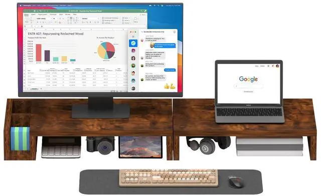 Ergonomic Comfort & Posture SupportThis 30"Long dual monitor stand riser elevates your screen to an ideal eye level, effectively reducing neck, shoulder and eye strain during long work or study sessions, helping you maintain healthy posture and all-day comfort ^^ Integrated Storage & Pen Holders for Tidy DesktopsDesigned with built-in storage and pen holders, this desk organizer neatly stores pens, notes, small office supplies and accessories, keeping your desktop clutter-free and maximizing valuable desk space ^^ Sturdy Rustic Wooden Construction & Stylish LookCrafted from quality solid wood with a classic rustic brown finish, this monitor and laptop stand provides stable, wobble-free support for long-lasting durability.