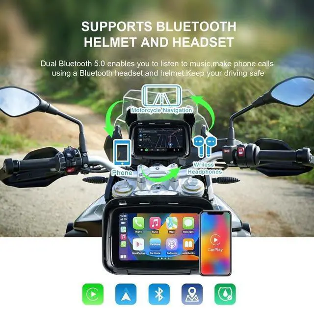 Wireless Apple CarPlay & Wireless Android AutoReplace your phone with a Bigger touchscreen motorcycle GPS. Use the CarPlay or Android Auto function to connect the mobile phone to connect the touch screen with Bluetooth, so that you don't have to take out your mobile phone frequently while driving, ensuring driving safety. Allowing you to navigate, you can make calls, and enjoy your favorite music seamlessly. ^^ Built-in Dual Bluetooth Pair your phone to the motorcycle screen via Bluetooth, wireless carplay or android auto will connect automatically. Pair the unit to your Bluetooth helmet/earphone via Bluetooth Emit, then you can make hands-free calls by your helmet or earphone without taking your hands off the handlebars.