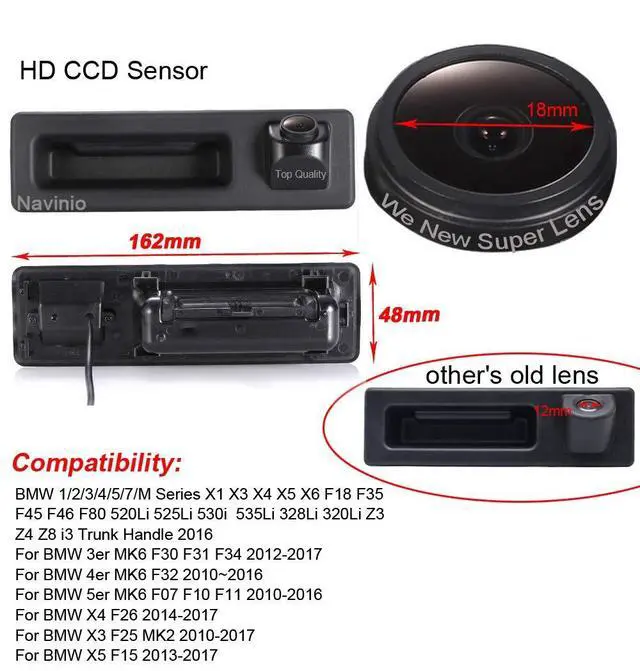 Dear customer, Please must check the camera size and appearance before place a order, see if can fit your car trunk handle place size and appearance! Because the same car model in different countries may have some difference, please check the camera size and compare the installation of your car carefully to avoid mistake. This product could fit for all below models as expected: Replacement for BMW 1/2/3/4/5/7/M Series X1 X3 X4 X5 X6 F18 F35 F45 F46 F48 F80 520Li 525Li 530i 535Li 328Li 320Li Z3 Z4 Z8 i3 Trunk Handle 2016Replacement For BMW 328i 2013; (choose No. LS8006)Replacement For BMW 3er MK6 F30 F31 F34 2012-2017Replacement For BMW 4er MK6 F32 2010-2016Replacement For BMW 5er MK6 F07 F10 F11 2010-2016Replacement For BMW X4 F26 2014-2017Replacement For BMW X3 F25 MK2 2010-2017Replacement For BMW X5 F15 2013-2017Replacement For BMW E90 320i sports(choose No. LS8003)Replacement For BMW 320i F30 2012(choose No. LS8007B)Replacement For BMW E60 E61 E70 E71 E72 E82 E88 E84 E90 E91 E92 E93(choose No.