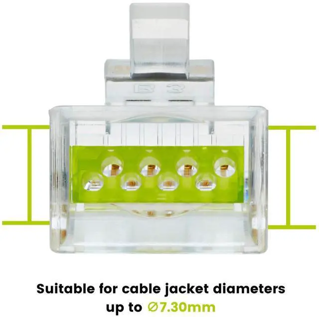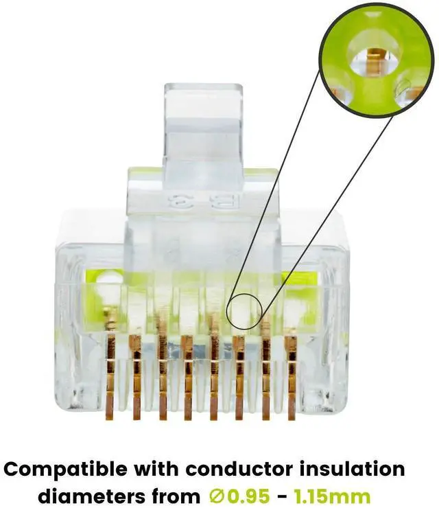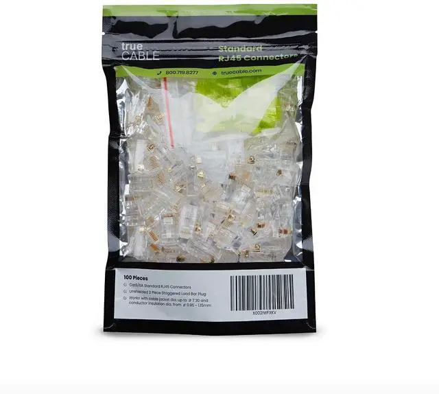 Supports Power over Ethernet: PoE/PoE+/PoE++ (IEEE 802.3 af/at/bt) 4PPoE up to 100W. ^^ VERSATILE. Great for Cat6 or Cat6A U/UTP cable. Works with 23AWG stranded or solid conductors. Suitable for cable jacket diameters up to 7.30 mm and conductor insulation diameters from 0.95 - 1.15 mm. Terminate with any standard crimp tool. ^^ PREMIUM QUALITY. ANSI/TIA 568 2. D Certified and validated with trueCABLE U/UTP Ethernet cable. ETL, UL, SGS (RoHS REACH / SVHC) Verified and Tested. FCC compliant. ^^ 100 PIECE RESEALABLE BAG. These transparent gold plated RJ45 plugs are sure to make your install hassle free.