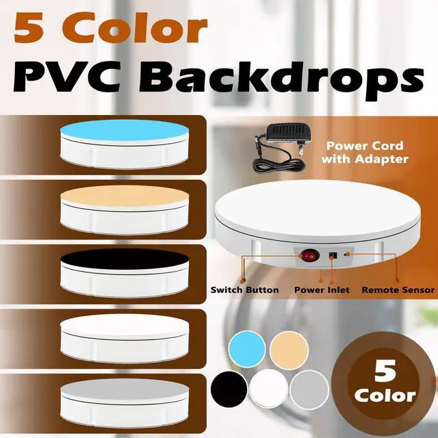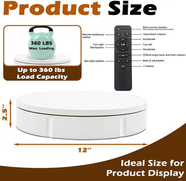 Perfect Size & Large Load-bearingOur rotating turntable is a versatile tool designed for display and photography. With a diameter of 12 inches and a height of 2.5 inches, it provides ample space to showcase products of various sizes. Its robust build and constructions supports a maximum load capacity of 360lbs, ensuring reliable presentation of both small weight items and extra heavy items (It requires being plugged into a power source to operate). ^^ Adjustable Rotation SpeedThe turntable offers 360-degree rotation with adjustable speed settings. You can configure the rotation speed to complete one full turn every 20 to 60 seconds, providing flexibility within the range of 20-60 seconds per rotation.