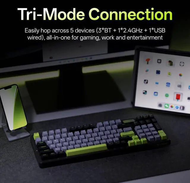 Tri-Mode ConnectionConnect using Bluetooth 5.0 (up to 3 devices), 2.4GH z or USB wired option, provides seamless switching between pc, laptop or mobile devices for gaming, work and entertainment. ^^ Hot-Swappable Speed Silver SwitchFeaturing pre-lubed linear speed silver switch with low spring resistance, the V700DIY delivers millisecond fast and direct triggers for a successful gaming session. ^^ 16.8M Per-Key RGBProvides enhanced customization with individual key backlighting control, creating unique color schemes and lighting effects synchronized with your personalized setups and in-game events. ^^ Gasket Structure with Creamy SoundUnique, integrated dampening foam with 7-layer switch-dampening pad structure absorbs pinging noises and echoes for improved keystroke acoustics.