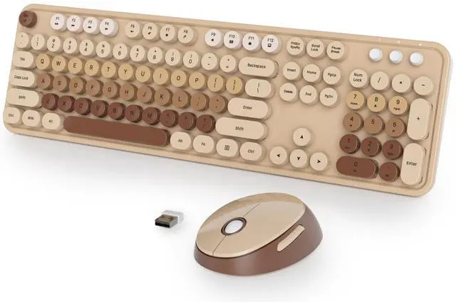 Retro Keyboard and Mouse Wireless The cute color & round keys make your desk look so much fun add vitality to your Desktop; Works with your PC, desktop computer, laptop. compatible with Windows 2000 / XP / 7 / 8 / 10/ vista ^^ Easy to Use & Plug and Play- 2.4GH z Wireless Connection35 feet working range, 2-in-1 nano receiver, no need to install other software, no delays or Drop the line, Make your desk surface more neat and tidy, Keyboard or mice can be used separately, just insert a single USB Receiver to use your Wireless Keyboard Mouse Combo ^^ 13 Multimedia Hot KeysThis typewriter keyboard wireless has 13 multimedia hotkeys for one-touch commands to enhance your productivity.