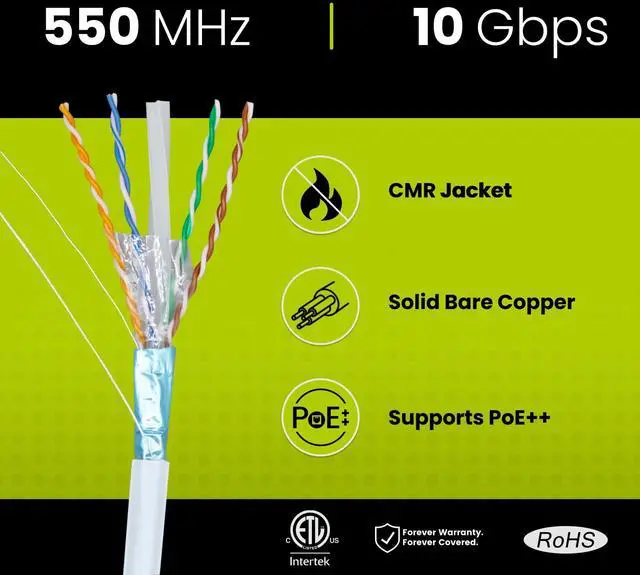 TRUE CABLE Cat6 Shielded Riser (CMR) Bulk Ethernet Cable, 1000ft, White, 23AWG Solid Bare Copper, 550MHz, Overall Aluminum Foil Shield (F/UTP), PoE++ 100W, ETL Listed