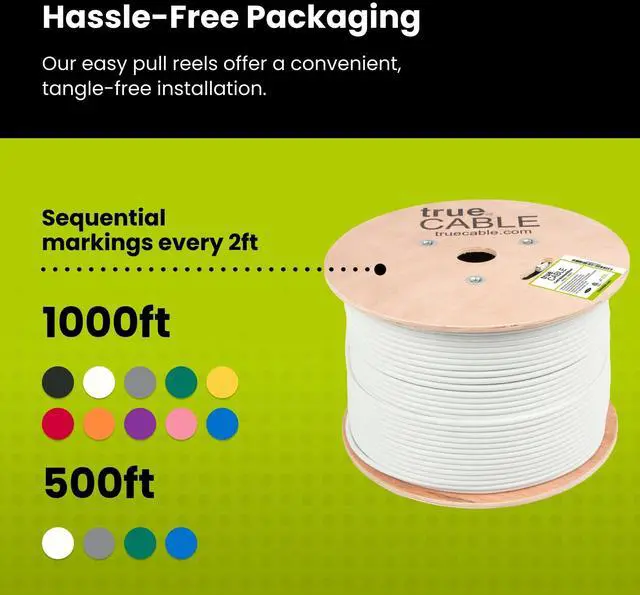 Supports Power over Ethernet: PoE/PoE+/PoE++ (IEEE 802.3 af/at/bt) 4PPoE up to 100W. ^^ [Versatile] Riser-rated PVC jacket is perfect for vertical runsbetween floors, in-wall, and non-plenum spaces. A solid choice for offices, home networks, or data centers needing high-speed, reliable Ethernet connections. ^^ [Easy To Use] Comes on a tangle-free, easy-pull reel with sequential 2ft markings on the ethernet cable for accurate measuring. Designed for indoor use to prevent fires from spreading floor to floor in vertical installations with mild flame retardance. ^^ [ Field Tested, Customer Approved] Our data cables have been tested with a Fluke DSX-8000 Versiv CableAnalyzer and comply with ANSI/TIA 568.2 -E standards, RoHS-3 compliant, and cETLus certified. Backed by our outstanding customer support.