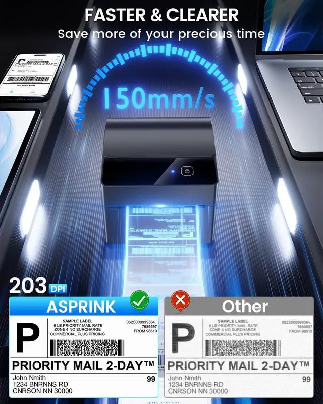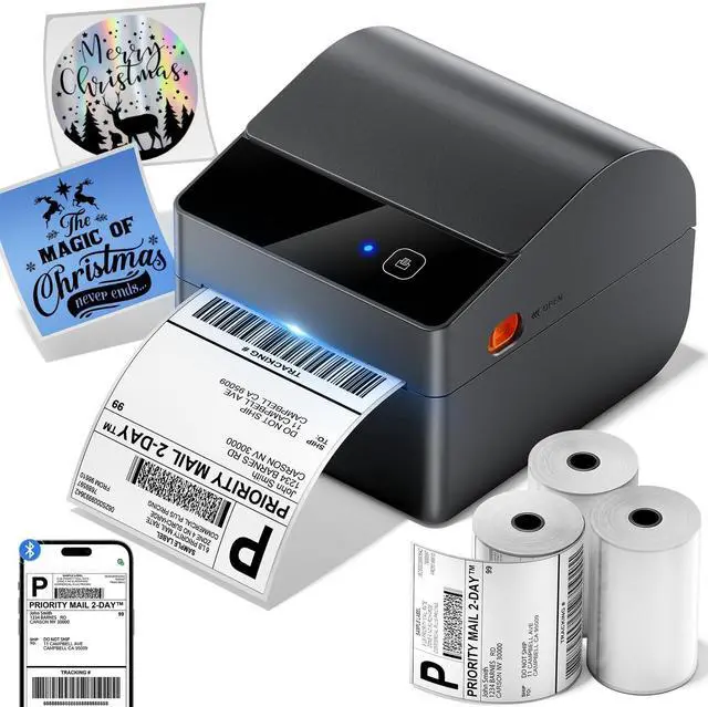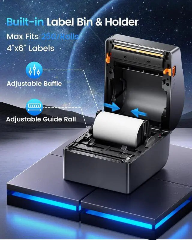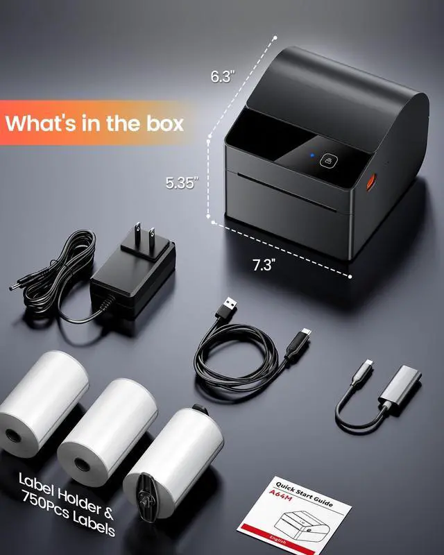 Practical & cost-effectivePackage with three rolls of 250pcs labels, large capacity and long-lasting. Less frequent replacement saves you time and effort, ideal for home and office labeling needs ^^ Revolutionary Built-in Label Bin DesignThe 2026 upgraded A64M label printer saves space with its innovative built-in label bin holding 250 4x6 roll labels, eliminating external holders. Measuring just 7.2 x 6.3 x 5.3 inches, this shipping label printer uses 50% less space than traditional models, freeing your workspace ^^ Upgraded Bluetooth ConnectivityFeaturing Bluetooth 5.0, the A64M shipping label printer connects Bluetooth wirelessly to computers (Windows/macOS) and mobile devices (iOS/Android) for true wireless printing anywhere! In addition, USB connectivity to computers is also supported, offering flexible setup options ^^ Versatile Labeling SizesA64M thermal printer Handle labels from 1 to 4.6 inches wide for diverse tasks: shipping, address, barcodes, retail pricing, inventory, warehouse organization, home decluttering and more, empowering you to tackle any labeling job with confidence ^^ Widely Platform CompatibilityThis thermal label printer seamlessly integrates with major platforms like USPS, UPS, FedEx,, Tiktok, Shopify, Etsy, eBay, PayPal, and 30+ others, supporting small businesses and home projects as they grow ^^ Smart SavingsUpgraded thermal tech eliminates expensive ink/toner costs. This Bluetooth label printer is equipped with 203 DPI print head and DAC chip, ensures sharp clarity at 72 labels/minute, while auto-calibration prevents 99% misalignment significantly cutting your printing costs