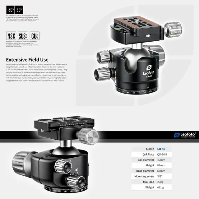 & Portable: The height of this ball head is 87mm/ 3.43", the diameter of the base is 57mm/ 2.24", the self-weight is 496g/ 1.09 lb, easy to carry. It can hold up to 20kg/44lb of camera equipmentEasy Operation with