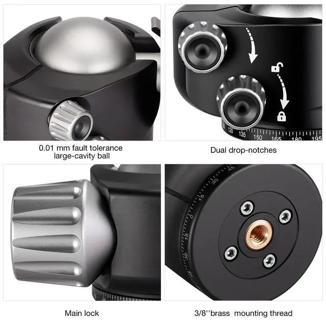Lock Knobs: Four locking knobs ensure easy setup and reliable security. Release the knobs to freely adjust the angle of the ball head, smoothly rotate the camera for panoramic shots and release the quick release plate. Tighten the knobs to hold everything securely in placeWide