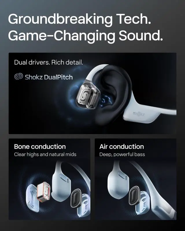 Unparalleled Audio - Dual drivers combine the clear highs of Bone Conduction Tech with the deep bass of Air Conduction Tech for 12 hours of powerful, 3D audio. ^^ Open-Ear Awareness - SHOKZ's signature open-ear design helps you power through your workouts while keeping you safely aware of your surroundings. Leak-free listening ensures your audio remains for your ears only. ^^ Secure and Stable Fit - The weight-optimized design of this unibody frame with ergonomic ear hooks integrates a Ni-Ti alloy memory wire to provide a secure, comfortable fit that defies slips and shifts.