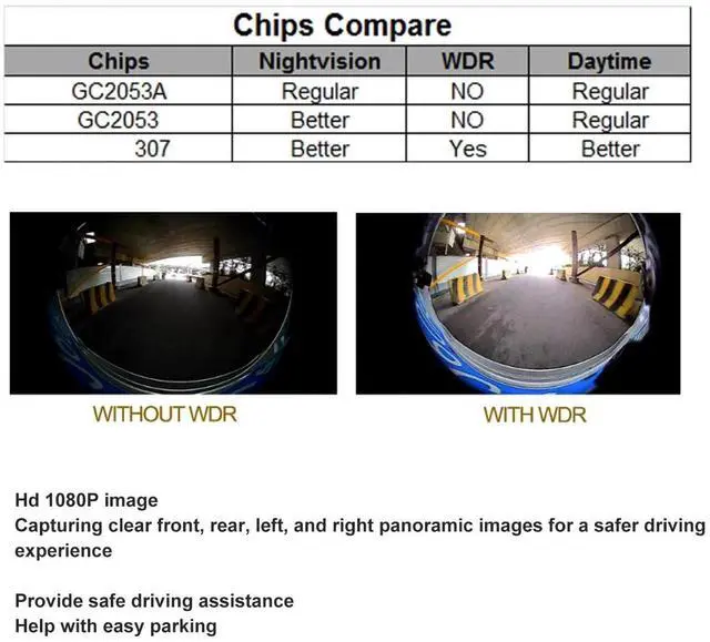 HD Imaging - Experience state-of-the-art 1080P video quality that captures every detail vividly. Whether you driving in the bright sun or dimly lit, this advanced imaging technology ensures clear visibility for safer navigation. With capabilities, you can drive confidently, knowing that potential hazards are never out of sight. ^^ 360 Surround View - an innovative panoramic surround view that eliminates blind spots around your vehicle. By providing comprehensive visibility, this system enhances your awareness, making it easier to navigate narrow lanes and crowded parking spaces. This feature significantly increases both your and your driving experience, giving you peace of mind.