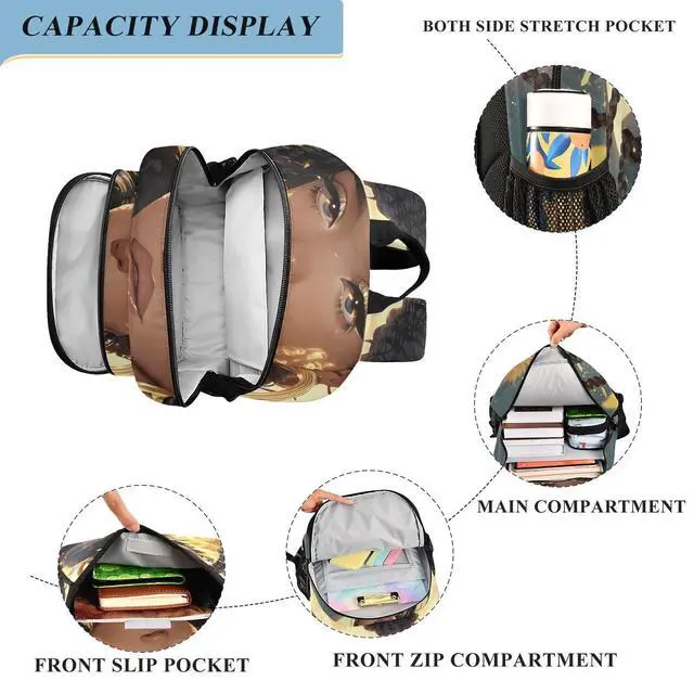 ^^ Multiple storage compartments: double zippers Large Main Compartment (include Separate Laptop Compartment, fits under 15.6 Inch Laptop. The compartments provide room to carry books, electronics accessories, A4 paper, binders, change of clothes). The Front zipper compartments provides a separate space for your smaller school supplies. There also has a small transparent compartment. Front slip pocket can hold pen, keys, wallet and more. two mesh water bottle, also fit an umbrella. ^^