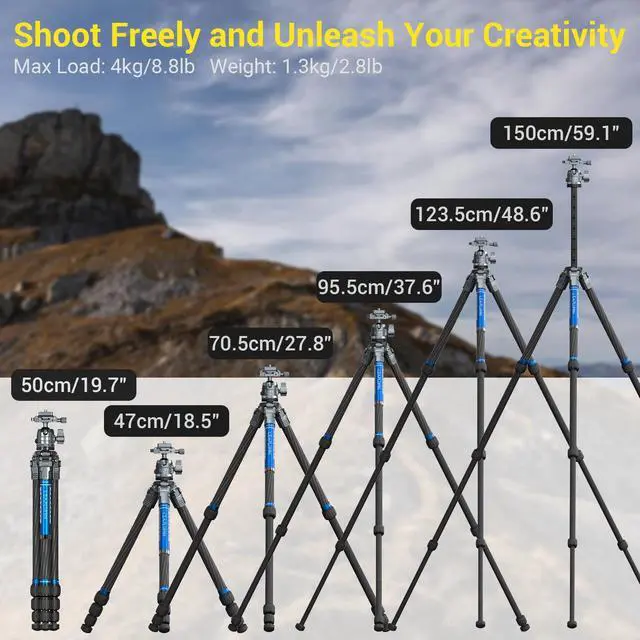 Ultra-Portable DesignLeaplumin Carbon Fiber Travel Tripod is engineered for adventurers on the move, featuring a compact storage height of just 50mm for easy transport. ^^ Versatile Height OptionsTriple height adjustment allows you to tailor the tripod to your needs. Reach an impressive 59" in height with the center column raised, achieve a stable 48.62 without raising it, and collapse it down to an ultra-compact 19.68 for easy storage. ^^ Center Column InversionEnhance your photography experience with the inverted center column feature, allowing for unique shooting perspectives and low-angle shots. ^^ Feather-Light ConstructionWeighing in at just 1.26 kg, this travel tripod is designed for minimal weight without compromising stability, ensuring you can carry it effortlessly wherever your journey takes you.