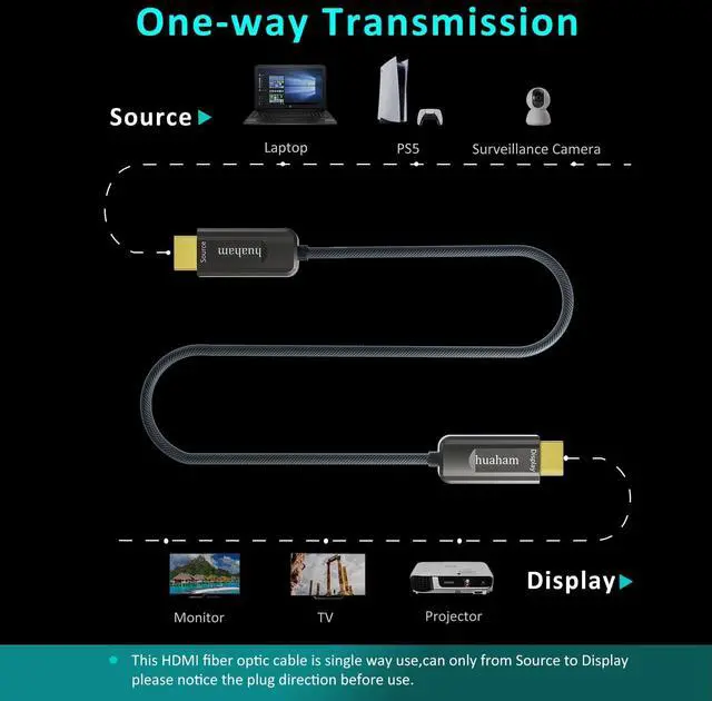 ^^ One-way Transmission OnlyFiber optic cable for transmitting video and audio signals via HDMI from source to display. It must be installed in the correct direction, the cable is not a bi-directional. The Cable with "Source" plug for connecting HDMI Out devices(Blu-ray player, STBox, Xbox one etc. ); "Display" plug for connecting your HDMI display devices(TV, Projector, Monitor etc. ) ^^ Life-Time SupportCommitted to providing every customer with the best quality products and services; The professional after-sale service team will provide prompt response and solve any issue. If you have any issue about the cable, please feel free to contact with us via.