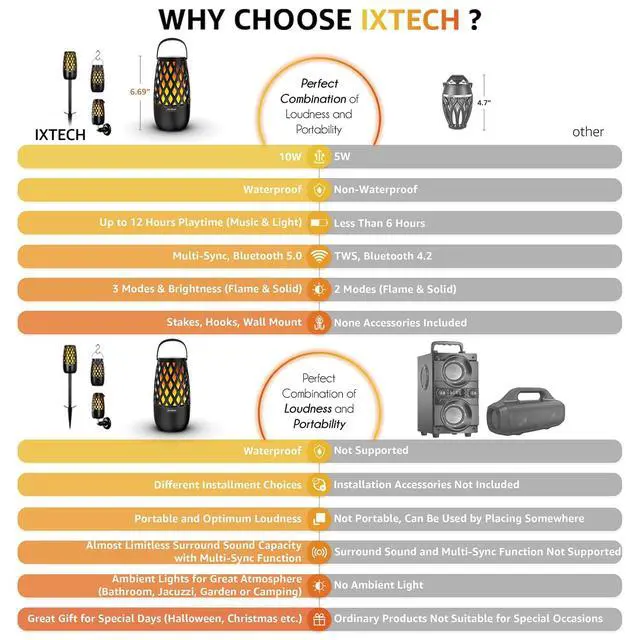 Premium LED Bluetooth Speaker This wireless Bluetooth speaker designed like a small tiki torch produces crisp, clear, illuminating sound in 360 and provides a relaxing and restorative music listening experience sure to enhance your space. ^^ Rich, Vibrant Sound and Deep Bass Our linkable Bluetooth speaker with 10 watts of power helps create deeper, more expressive sound variances to really capture the highs and lows of your favorite songs, podcasts, and other musical choices. ^^ Elegant Atmospheric Lighting The IXTECH LED Bluetooth speaker features three unique lighting modesincluding dancing flame, candlelight, and solidto help you create the most exciting, relaxing, or restorative indoor or outdoor atmosphere.