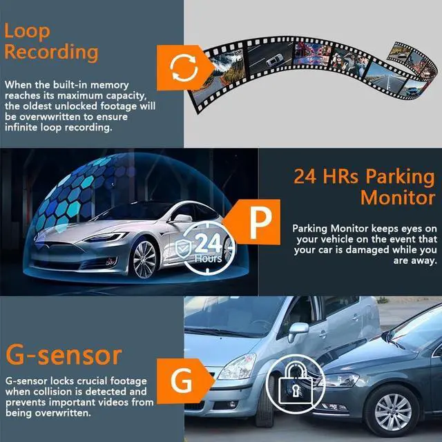When memory card is full, the earliest recorded video will be automatically deleted to achieve seamless loop recording. ^^ G-Sensor The 360 view dash cam features a smart mode while driving. When detecting a sudden impact, the dash cam will automatically start emergency recording. The video will be saved and locked in the emergency video category and won't be overwritten by loop recording, ensuring the evidence won't be deleted. ^^ Infrared Night Vision Car Security CameraWith high-performance sensor, 8-glass lens observing road front and observing rear, this car camera is able to increase exposure automatically in dark situations for capture clear videos footage; 8 IR LED lights facing the car cabin, which can accurately capture the driver and passengers even when the cabin is completely dark. ^^ Advanced 5GHz WiFi with App Featuring cutting-edge 5GHz WiFi and a free app, the video download speed reaches up to 8MB/s, compared to just 2MB/s with the 2.4GH z option. This greatly reduces download times and minimizes lag during video playback. ^^ Easy Insatllation and Operation360 Dash camera is plug and play, very convenient. Simple to mount the 4 channel dash camera on the windshield which makes for an overall straightforward installation process.