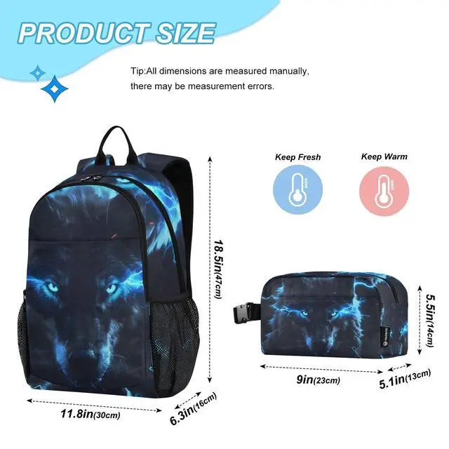 Quantity: 2 PCS - school backpack + Lunch box. Made of high quality and lightweight polyester. Smooth zipper, adjustable padded straps protect your back and padded cushion protect your laptop.
