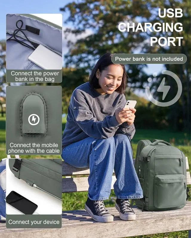 Durable MaterialThis travel backpack is made of high quality waterproof nylon fabric, making this backpack stronger and more durable. Backpack straps are adjustable with padded shoulder straps for comfortable carrying. ^^ USB Charging PortUSB port design with external USB port and built-in charging cable. Charge your electronic devices by connecting your own power bank, providing a more convenient way to charge your cell phone, ipad and laptop. ^^ Large CapacityThe main pocket can hold your personal belongings, clothes, etc. Keep your items organized and easier to find. In addition to the main pocket, there are two pockets on the front of the backpack for miscellaneous items.