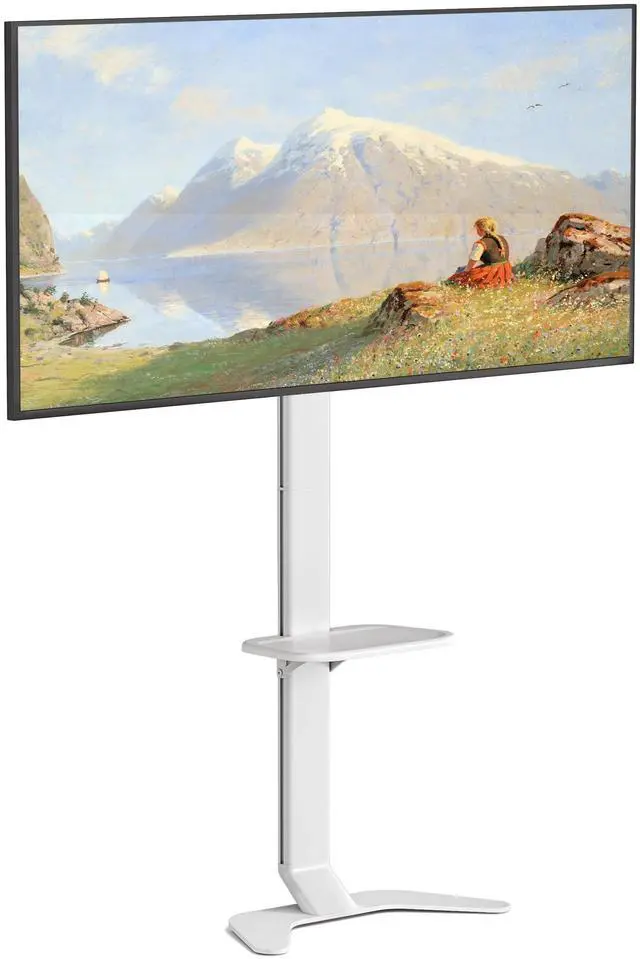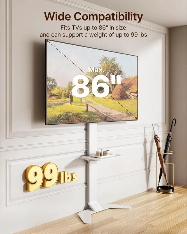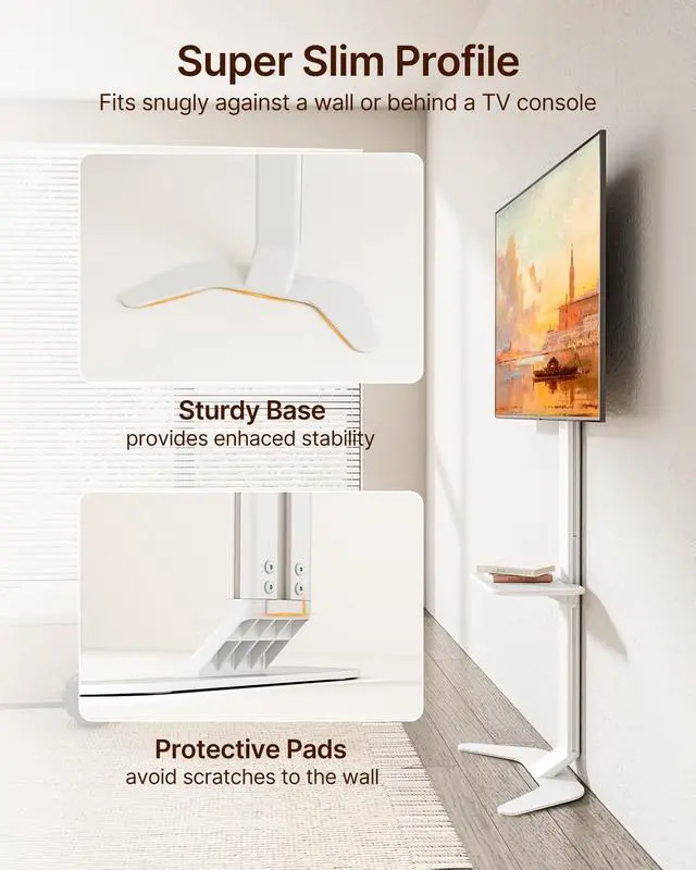 Ultra-Slim & Space-Saving Aesthetics: Featuring a sleek, minimalist silhouette, ECOTINYs TV floor stand leans cleanly against the wallno bulky brackets or messy mounts. The premium aluminum curved base is engineered to fit neatly over baseboards, providing strong ground support while seamlessly blending into any modern home decor. ^^ Universal Compatibility for 37"-86"