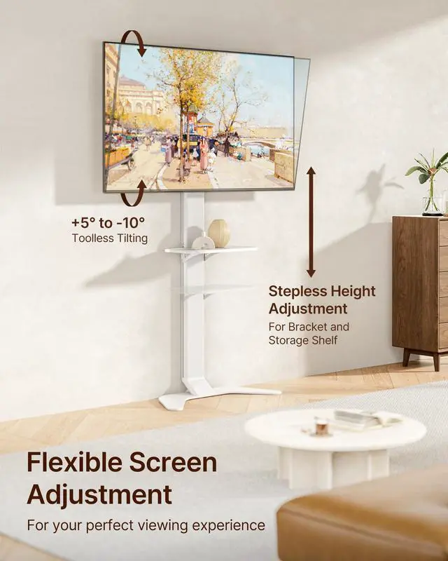 Tilt Adjustment: Find your perfect viewing angle in seconds. The no-drill TV stand features stepless height adjustment ranging from 45.7 to 53.5 (standard version 35.4 - 43.3 ) to perfectly match your couch, bed, or standing setup. With tool-less screen tilting, you can easily reduce glare and customize your comfort without searching for a wrench. ^^ Cable Management & Adjustable FSC-Certified AV ShelfKeep everything tidy and within reach. The integrated cable routing hides messy wires, while the height adjustable FSC-certified wooden shelf adjusts up or down to accommodate your A/V gear, gaming consoles, or decor pieces.