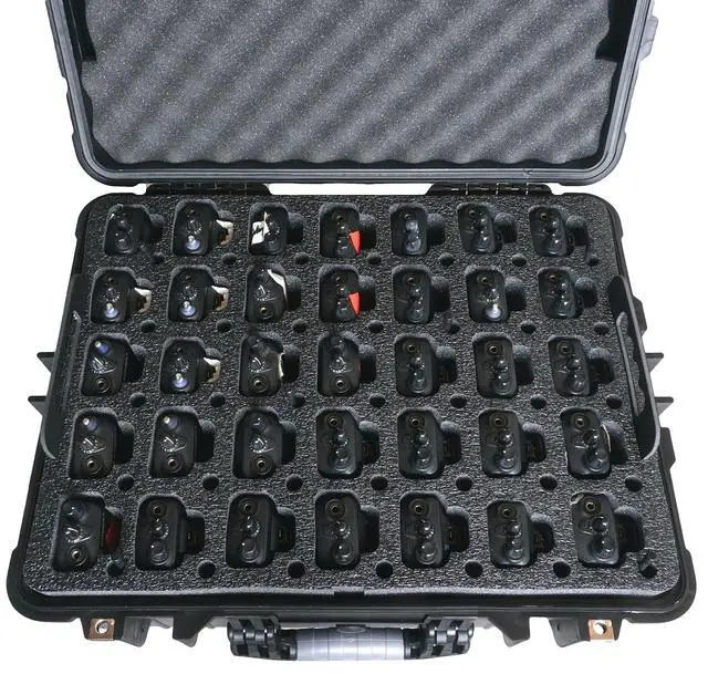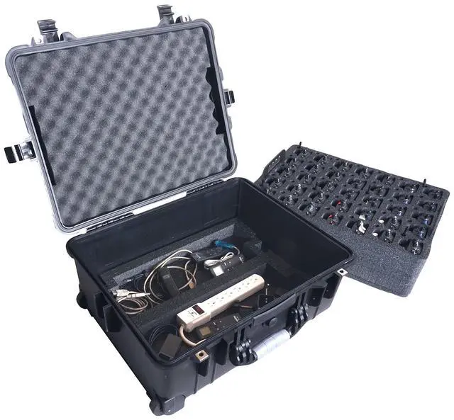 Case fits Quantity 35 Motorola R2 / CP200 / XPR 3500e Radios & 35 Antennas on the removable top tray, plus assorted cords and accessories in the bottom accessory area ^^ Tilt wheels and Extension Handle for easy transport. 100% Waterproof (IP67) & Dustproof. Built-in pressure release valve for changing altitudes. ^^ Base foam is heavy duty, non-abrasive, pre-cut, mil-spec, closed cell polyethylene which won't absorb moisture or oil ^^ Case is 100% shippable and airline approved for TSA checked luggage, and case is secure with two padlock points that support a customer supplied padlock with a 1/4" shackle ^^ Does NOT include radios, antennas, or radio accessories.