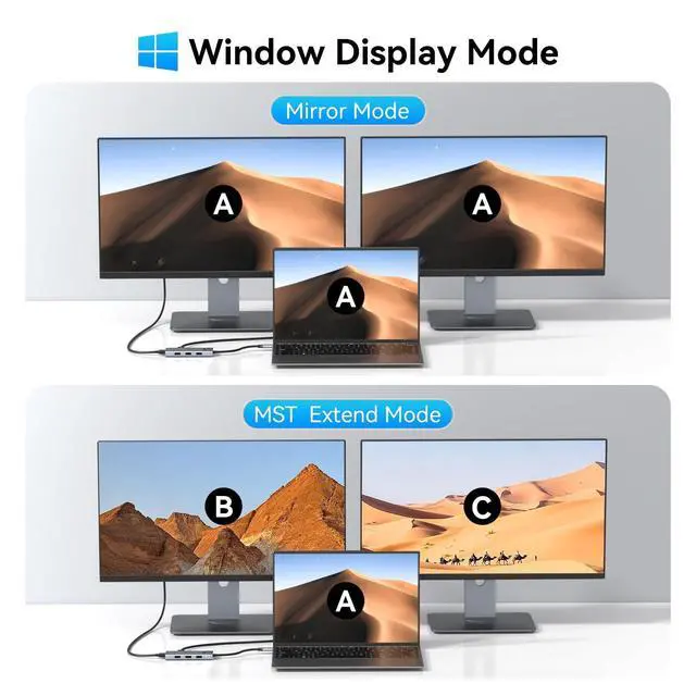 Monitor Docking Station: USB C Hub with 2 HDMI port use HDMI port to enter mirror mode for usb c laptops or extended mode and transfer 4 K 60 Hz HD video with 3D effect from laptop screen to a monitor, projector, HDTV, etc. Support both SST and MST mode. Support dual display for your windows laptops. 2 HDMI ports can be used simultaneously, resolution up to 4 K 60 Hz. Please note that if you use it to connect macbooks, it only support mirror mode without extended mode ^^ Data Transfer USB C Hub with 2